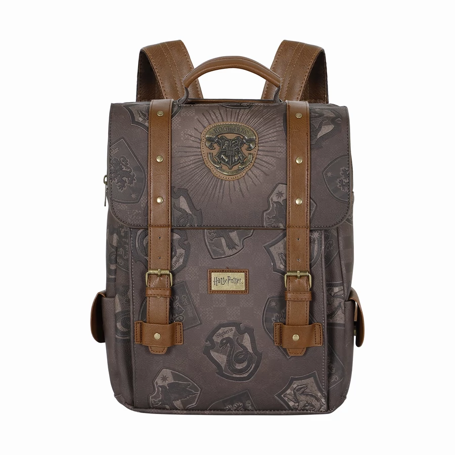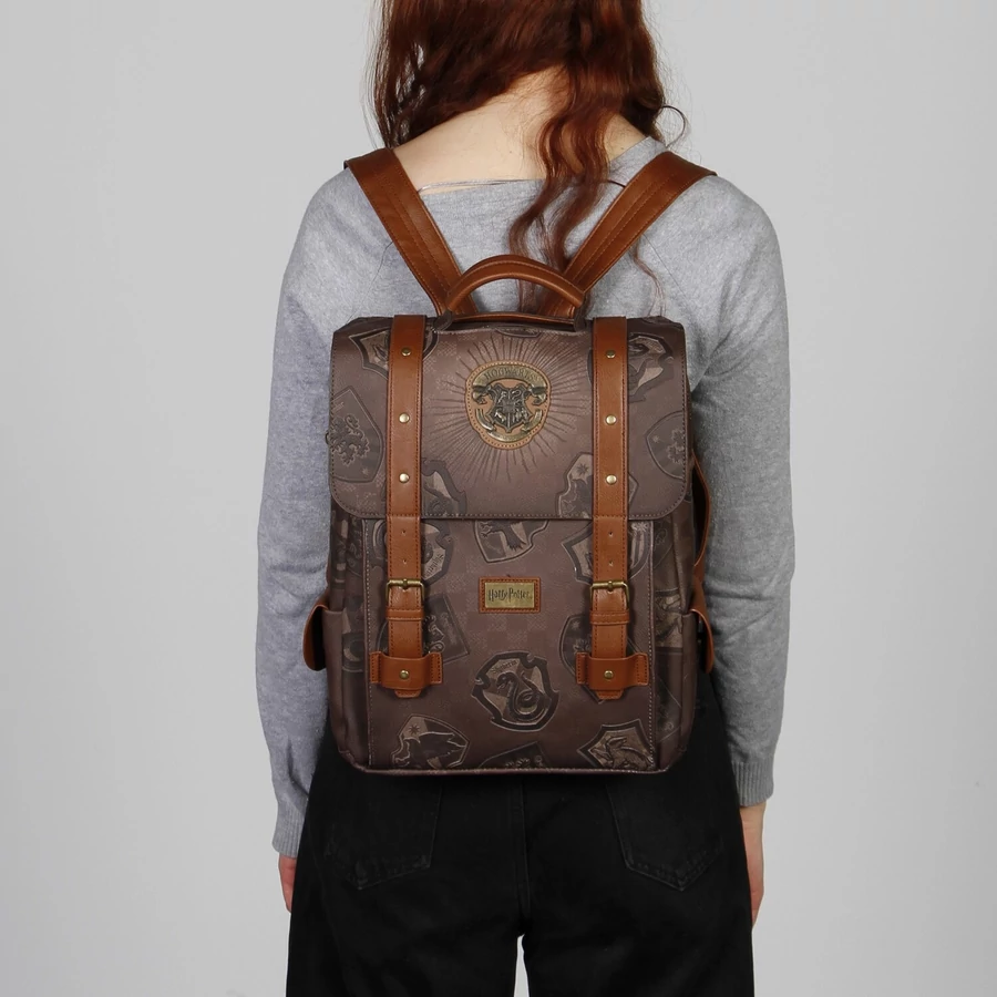 A Harry Potter „Pride” kollekciójának elegáns hátizsákja ideális választás mindennapi használatra, iskolába vagy munkába. A barna alapszínű táskát a Roxfort házak címerei díszítik, az elülső zseben fém "Harry Potter" felirat, a fedlapon pedig fém Roxfort címer található.