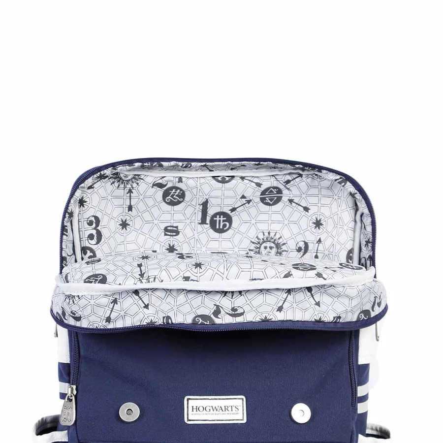 A mágneses csatokkal záródó hajtóka alatt cipzáras főrekesz található, benne párnázott elválasztóval, amely ideális laptop vagy tablet tárolására. A táska emellett több praktikus zsebet is kínál: elöl és oldalt is található pakolórekesz, valamint kényelmes, „Hogwarts” feliratos, állítható vállpántok gondoskodnak a komfortos viseletről. A belső bélés varázslatos mintázatával még különlegesebbé teszi ezt a kiegészítőt.