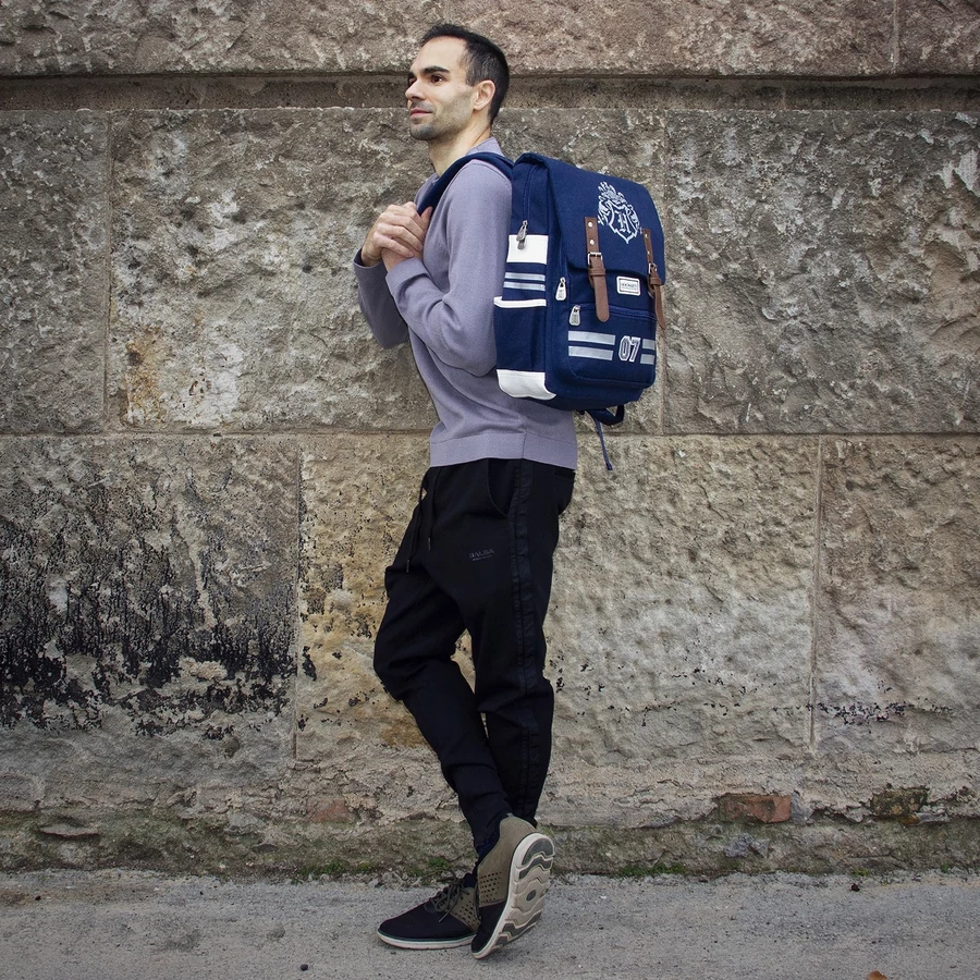 Légy stílusos akár a muglik, akár a varázslók világában ezzel a prémium minőségű Harry Potter „Academy” Oxford hátizsákkal! A sötétkék alapszínű hátizsák elején a Roxfort címere díszeleg, alatta pedig a 07-es szám – ami nem más, mint Harry Potter kviddicsmezének ikonikus száma.